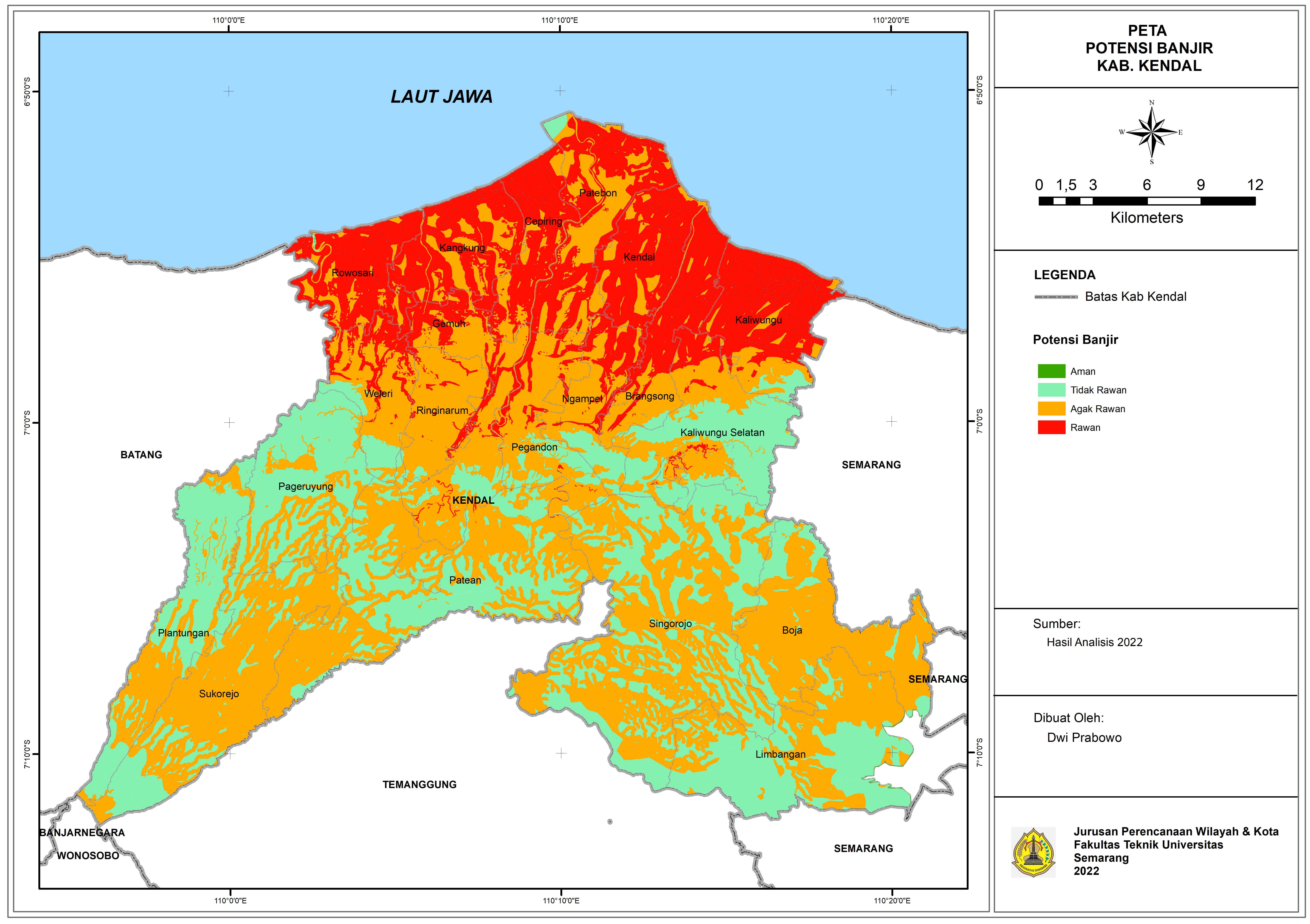 Tidak terpenuhinya kebutuhan lahan permukiman di pusat Kota Semarang mendorong pembangungan perumahan di Kawasan Sub Urban Kota Semarang yang merupakan faktor utama terjadinya alih fungsi lahan dari non terbangun menjadi terbangun. Mengetahui potensi kerawanan banjir di daerah sub urban kota semarang diperlukan untuk upaya mitigasi bencana banjir akibat perubahan alih fungsi lahan tersebut. Data curah hujan, kemiringan lahan dan ketinggian lahan, jenis tanah dan penggunaan lahan serta kerapatan sungai digunakan sebagai parameter kerawanan potensi banjir. Setiap parameter dilakukan proses scoring dengan pemberian bobot dan nilai kemudian dilakukan overlay menggunakan software ArcGIS. Kemudian dilakukan survai lapangan untuk melihat validasi lapangan pada daerah rawan banjir. Hasil penelitian didapatkan total wilayah rawan banjir adalah 21.196, 79 Ha atau sekitar 21,02 persen dari keseluruhan luas Kabupaten Kendal. Dua Kecamatan yaitu Kecamatan Kaliwungu dan Kecamatan Brangsong merupakan Kawasan Sub Urban Kota Semarang yang paling banyak luasan daerah rawan bencana banjir.